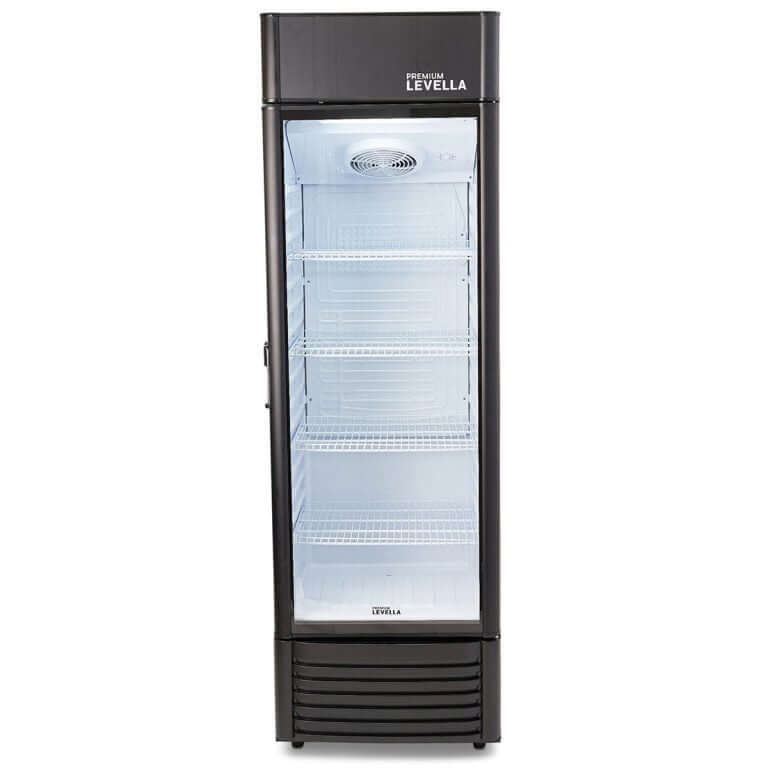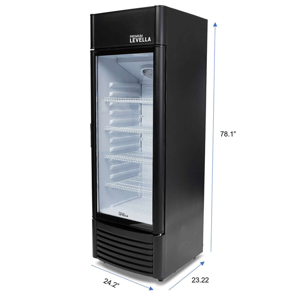 Premium Levella's line of commercial display fridges come in silver and black and have different storing capacities measured in cubic feet. You will also find single, double, and triple door options. Each fridge has a glass door, interior lighting, door lock, internal cooling fan, adjustable shelving, balanced temperature control, and a customizable lightbox for your businesses logo.