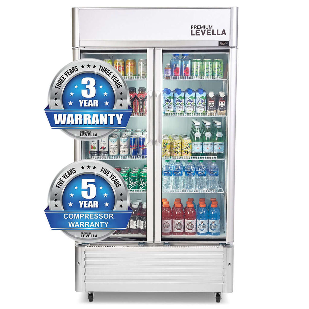 Premium Levella's line of commercial display fridges come in silver and black and have different storing capacities measured in cubic feet. You will also find single, double, and triple door options. Each fridge has a glass door, interior lighting, door lock, internal cooling fan, adjustable shelving, balanced temperature control, and a customizable lightbox for your businesses logo.
