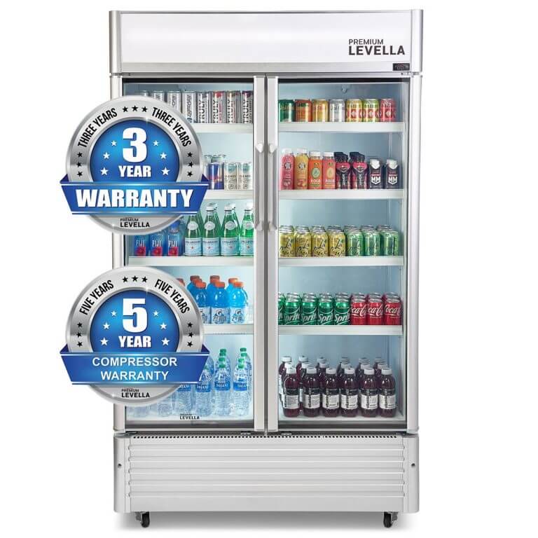 Premium Levella's line of commercial display fridges come in silver and black and have different storing capacities measured in cubic feet. You will also find single, double, and triple door options. Each fridge has a glass door, interior lighting, door lock, internal cooling fan, adjustable shelving, balanced temperature control, and a customizable lightbox for your businesses logo.