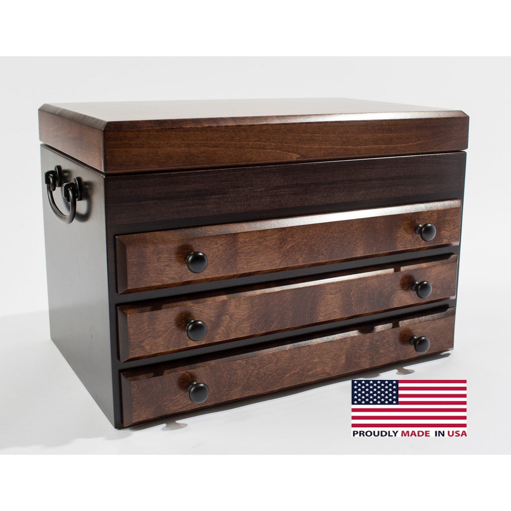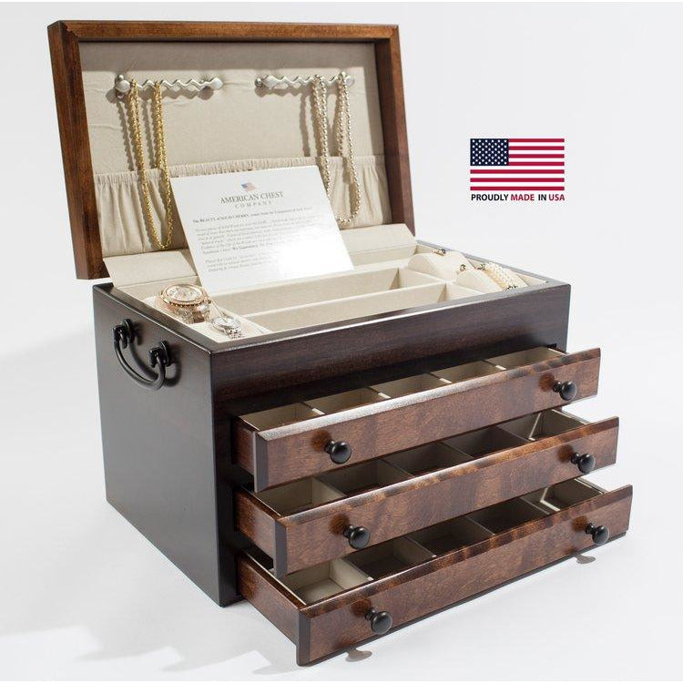If you have jewelry on the night stand, in the bathroom, or necklaces hanging on the back of door knobs then you've come to the right place. Jewelry Box storage helps preserve your most precious accessories, allows for a central storage location, and keeps it organized with different compartments. The most reliable jewelry storage solutions are here and they are hand-crafted and American made! With decades of tradition perfecting the craft, American Chest Company brings the most durable and lasting storage chest to you.