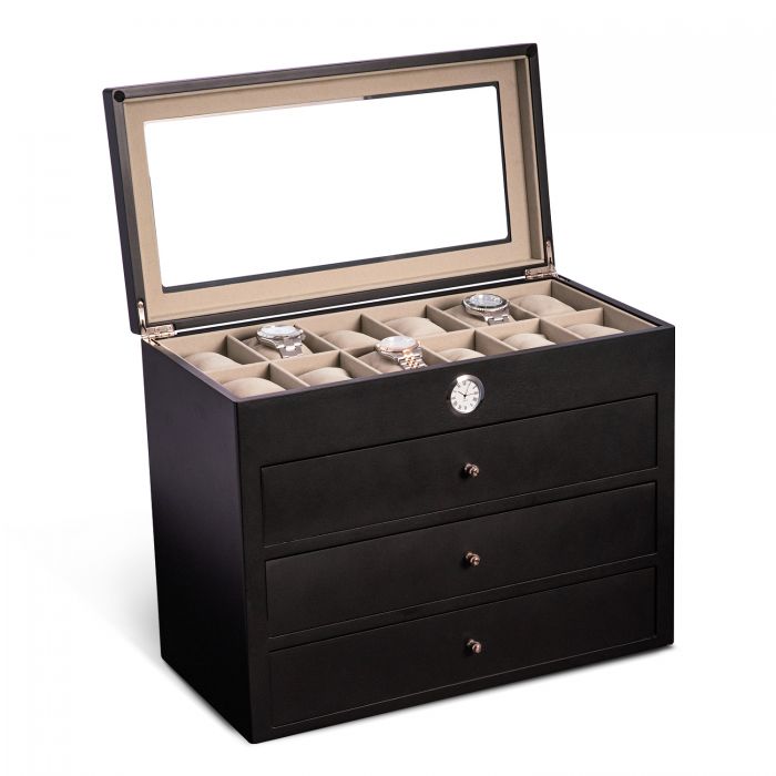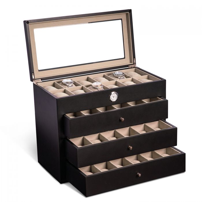 Bey-Berk “All in Time” 48 Slot Watch Box | Black Wood | Glass Top and Drawers | CM786BLK