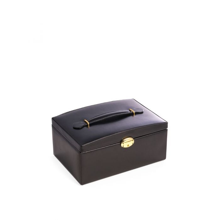 A luxurious housing for your most cherished accessories. The Bey-Berk Adele leather jewelry box includes multi-compartments to keep everything safe and tidy. Our soft velour lining not only looks amazing but provides for a soft landing for your most precious gems. A great addition to a well-appointed dressing table. Black Leather 2 Level Jewelry Box with 3 Drawers, Removable Travel Tray, Mirror and Locking Clasp.Â