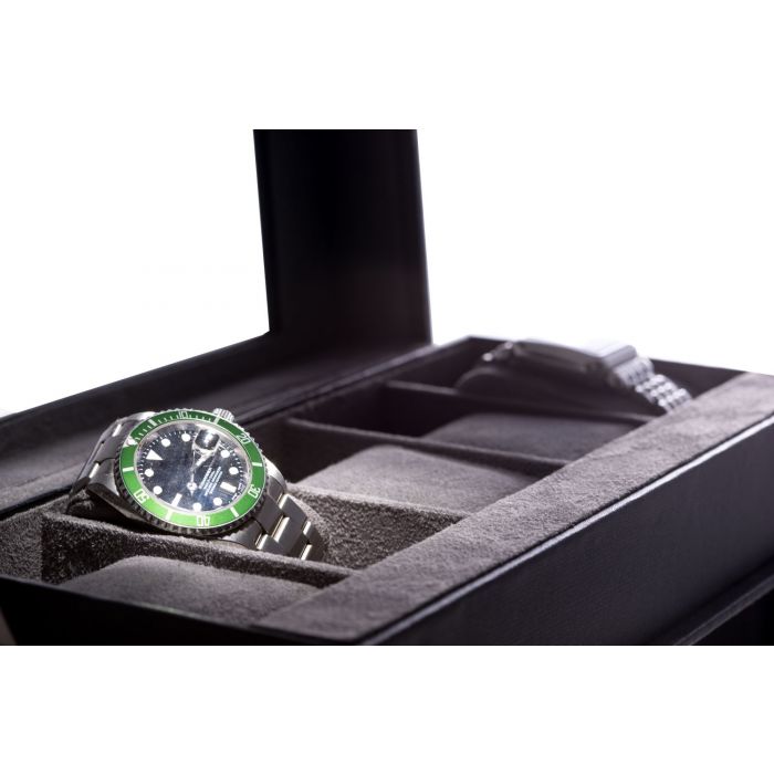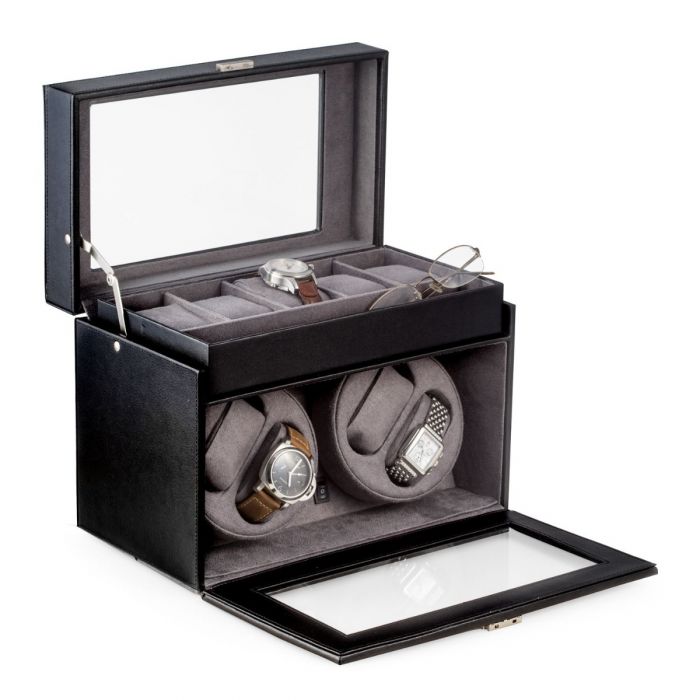 Our Viceroy watch winder is the perfect addition to any watch enthusiasts collection. Wrapped in genuine leather and lined in soft grey velour lining, it makes for the perfect home to store your collection. Our watch winder allows you to wind 4 watches simultaneously. Additionally, a top storage compartment provides additional storage for 5 watches and accessories. A locking clasp completes this gorgeous piece. The Black Leather Four Watch Winder and 5 Watch Storage Case with Locking Clasp Features a Selectable Single or Dual Direction Rotation. Rotates over 4300 Times a Day. Works on Both AC or DC Back Up Power.