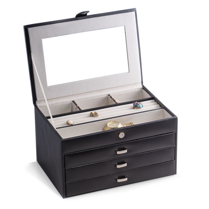 Generously sized black leather jewelry box safeguards even the largest collections. While it looks like a standard box on the outside it reveals dozens of compartments for everything from necklaces to rings. Velour lining ensures soft landing for your treasures and snap closure keeps everything neatly tucked inside. Black Leather 4 Level Jewelry Box with Multi Compartments, Mirror, three drawers, Soft Velour Lined and Snap Closure.