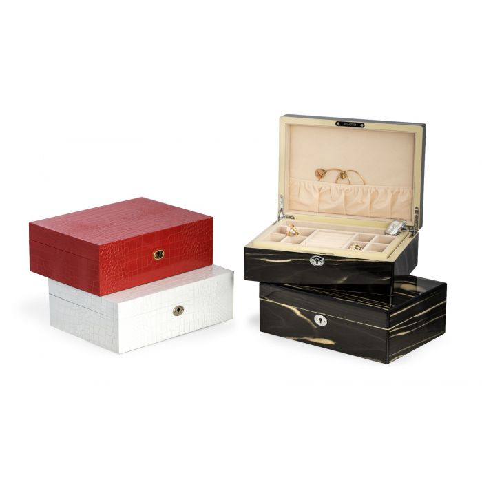 A luxurious housing for your most cherished accessories. The Bey-Berk Vanessa lacquered "Ebony" wood jewelry box with valet tray includes multi-compartments to keep everything safe and tidy. Our soft velour lining not only looks amazing but provides for a soft landing for your most precious gems. A great addition to a well-appointed dressing table. Lacquered "Ebony" Wood Jewelry Box with Valet Tray and Key Lock