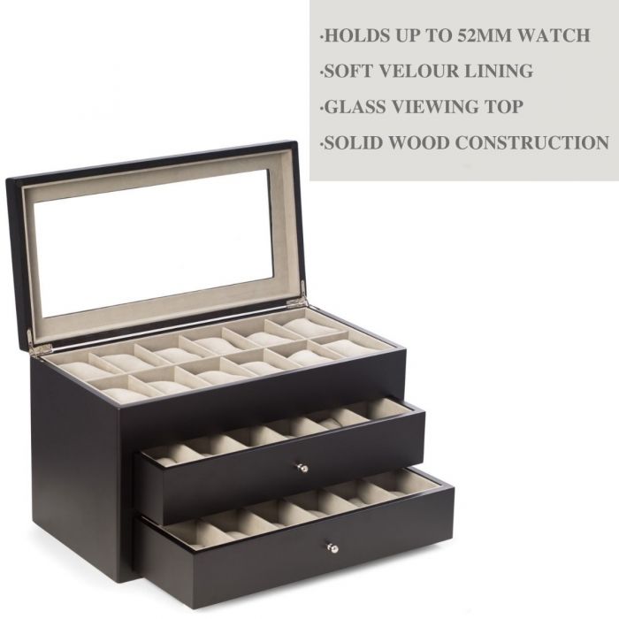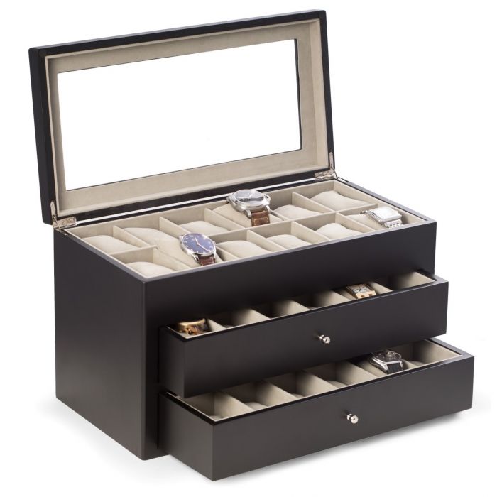 Bey-Berk 36-Watch Box | Glass Top & Drawers | Matte Black Wood | BB686BLK