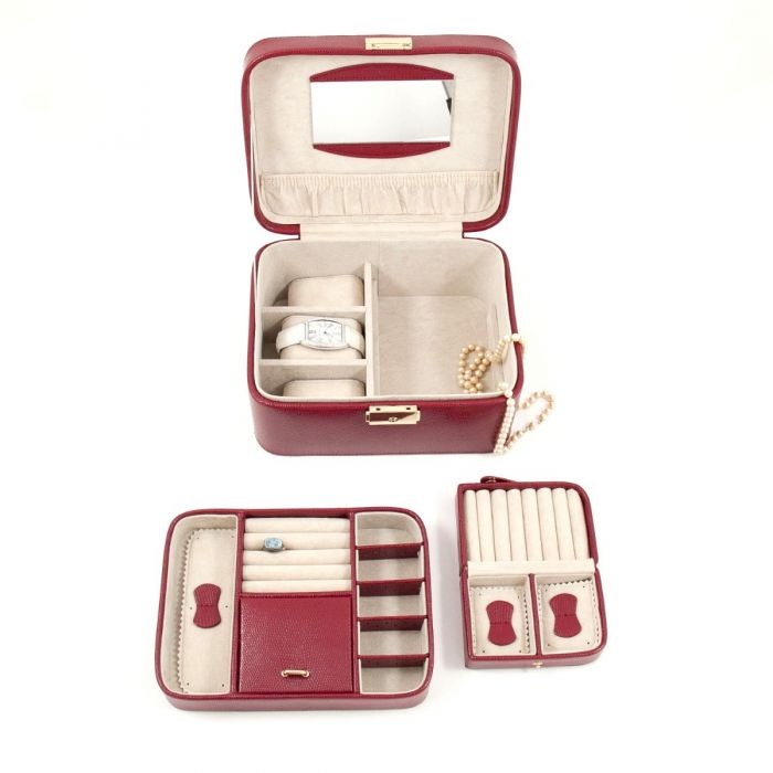 Red "Lizard" Debossed Leather Jewelry Box. Features a Removable Valet Tray on Top with Slots for Rings, Tabs of Stud Earrings and Hinged Compartment. Also Includes on the Bottom a Travel Case for Rings and Earrings as Well as Compartment for 3 Watch / Bracelet. It's Soft Velour Lined with Mirror Under Lid and a Locking Clasp.