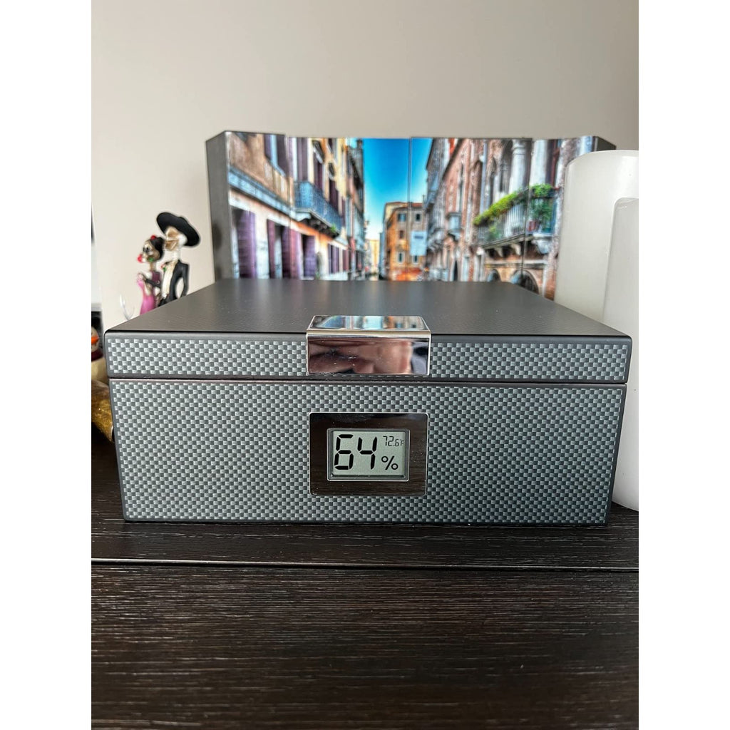 The Kingston Carbon Fiber Finish Humidor. We found out the hard way that seasoning your cigars can be a tricky process and ends up being largely inaccurate. To solve this industry-wide problem, we carefully embedded a digital hygrometer in the front of the humidor that will precisely monitor the humidity levels. We have thoroughly examined this humidor in wet, temperate, and dry environments to assure the best levels of humidity for your cigars. This premium humidor features a modern carbon fiber finish, front digital hygrometer, patent-pending Hydro System, Spanish cedar, and the tightest magnetic enclosure on the market.