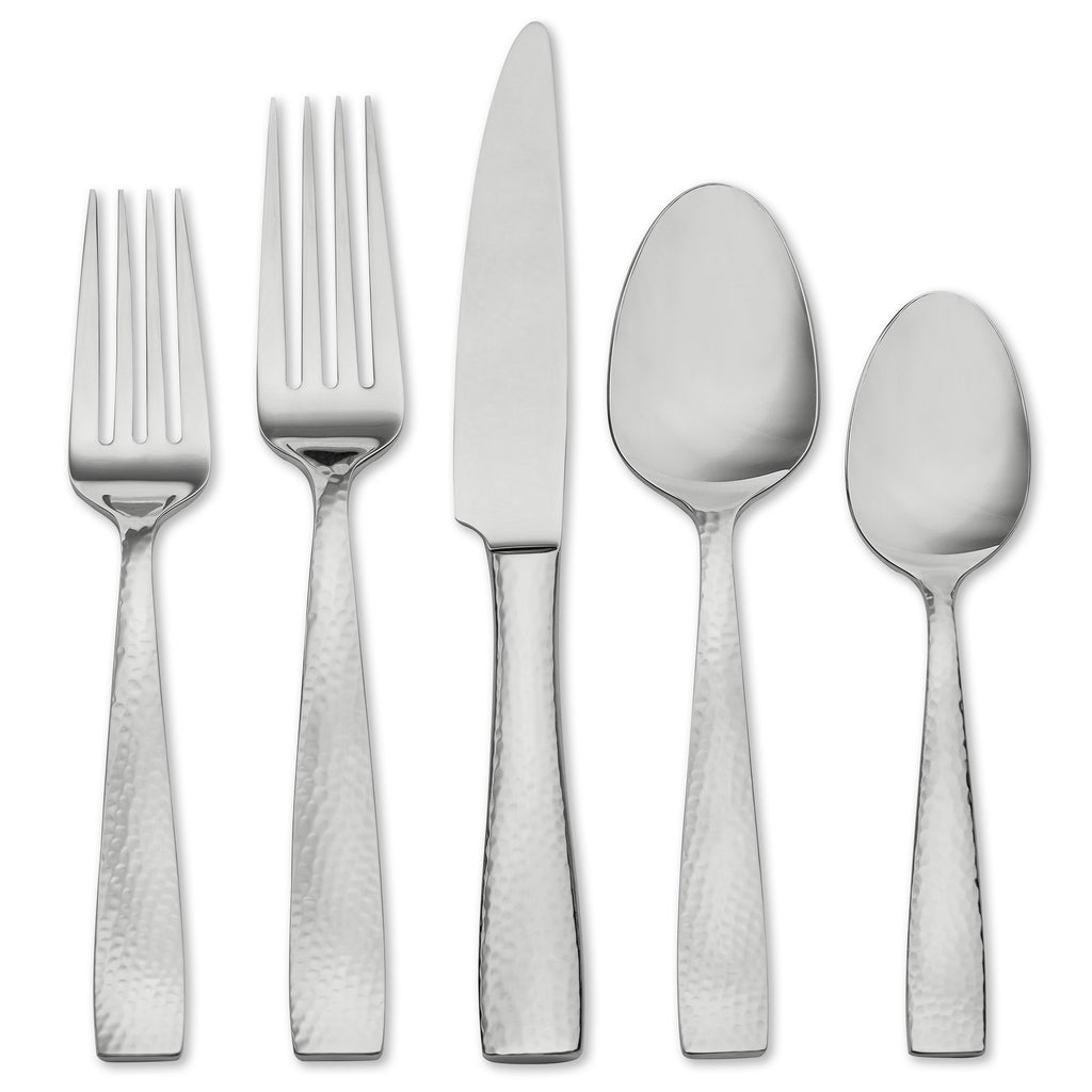 Make a statement as you set the table with the Vento Hammered Flatware Set by Hampton Signature. With the look and feel of the finest hand-hammered metal, Vento features a unique textured handle that gives it a ruggedly metropolitan appeal. Crafted of versatile stainless steel with a slightly tapering bodice, it's ideal for both everyday use and formal occasions alike and promises to be one of the highlights on your tabletop.