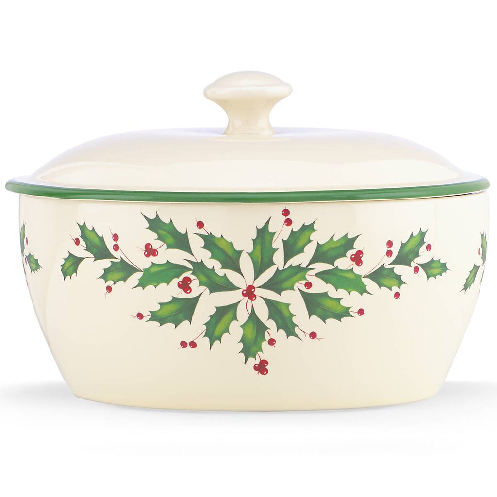 The Hosting the Holidays Casserole Dish is ideal for serving large dinner parties. Crafted in ceramic, this spacious dish features a festive holly that comes with a matching lid.