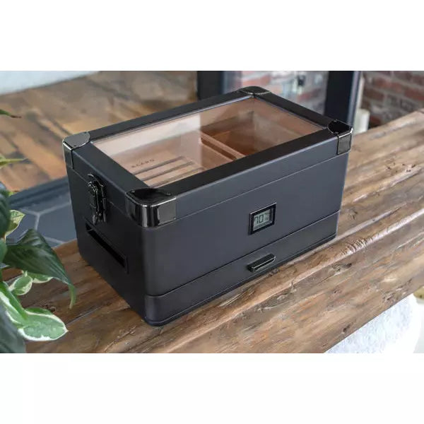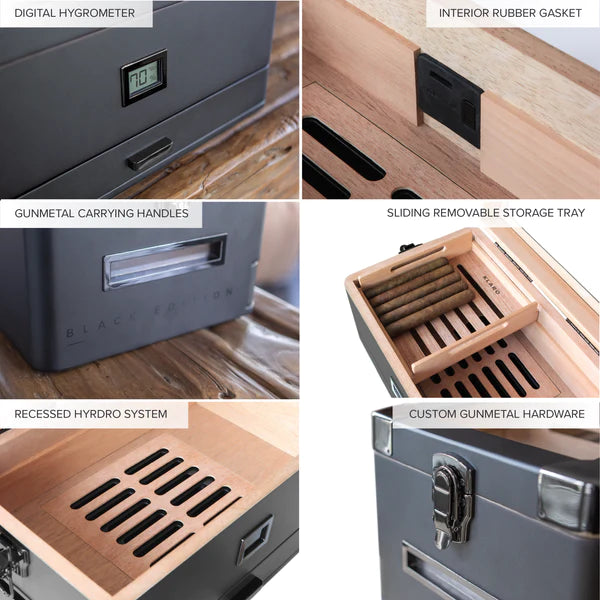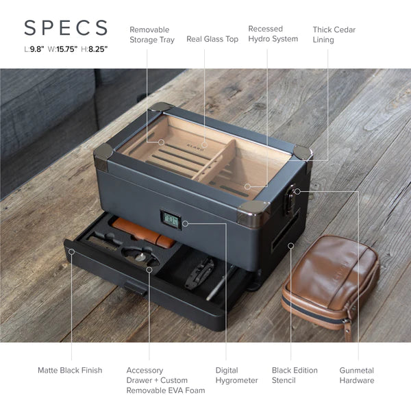 AFICIONADO APPROVED -Â Constructed out of thick wood and Spanish cedar inlay; this humidor is the real deal. The exterior flaunts a matte black finish with custom polished gunmetal components, including corner guards, side lid latches, handles, and the front digital hygrometer. We've also included a removable storage tray that's slidable. No more having to remove the top tray to reach the cigars you want in the bottom.