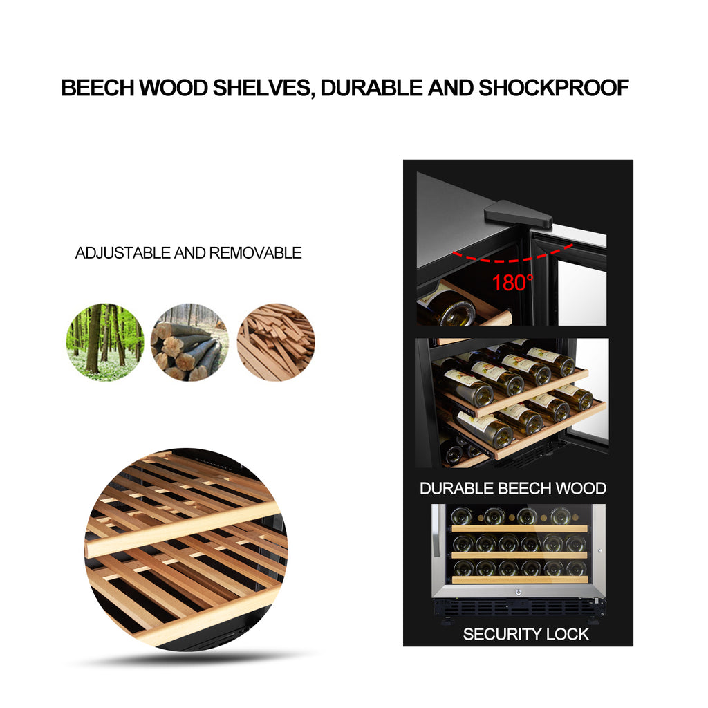 - Dual Zone Design: Different wine need different temperature to store. This dual zone wine cooler are designed for who enjoys kinds of wine, but wants to save room. The temperature range for the upper zone is 41-54℉, and the lower zone is 54-64℉. There are 3 shelves in these two zones, and 23.4 inch wide can load large bottles as long as removing 1 or 2 removable shelves.