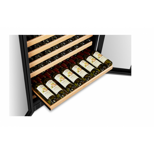 Storing your favorite wine at an optimal temperature is a breeze with this product. This beautiful black dual door dual zone refrigerator meets all your wine collecting and storage demands. Beautiful wood shelves with slats keep your wine in a steady state while offering you a sense of comfort and peace of mind. Soft internal lighting provides visibility into your treasured collection. Equipped with a quiet and low-vibration compressor, it is sure to go unnoticed. There is nothing more satisfying than enjoying a glass of wine after a hard day!Â