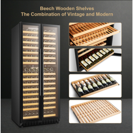 Wooden shelves: The wine cooler come with 16 beech wooden shelves, each shelf has slide rails, make a easily to access and place bottles. Sturdy shelves makes you feel more secure in storage.