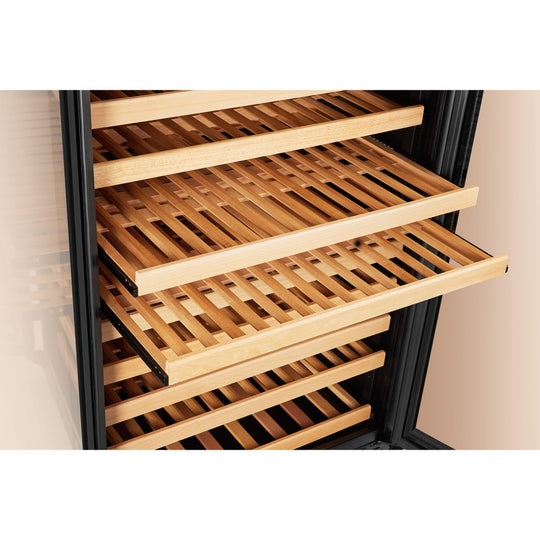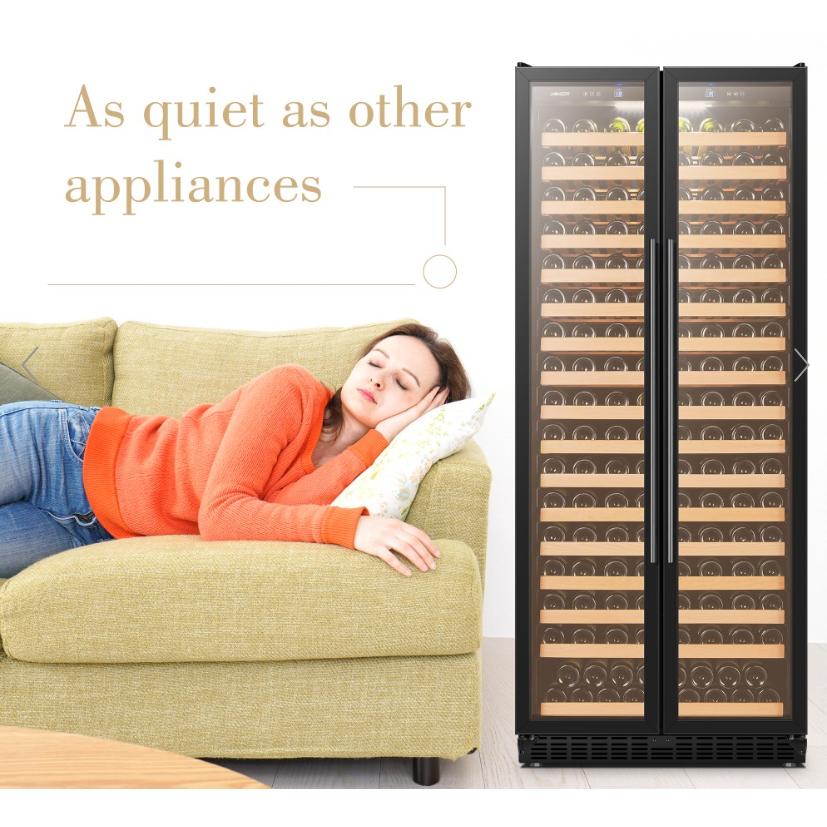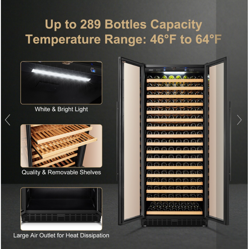 The key to enjoying a flavorful, robust glass of wine is to keep your collection in a space that maintains a consistent temperature to ensure integrity and flavor. This product is a luxurious and stylish black dual door single zone compressor wine cellar, ideal for collecting and storing up to 289 bottles of your favorite and most treasured wines. Featuring a whisper quiet fan, as well as a low vibration compressor, providing the perfect wines for your party or gathering without all the noise. Soft internal LED lighting allows you to display your collection on beautiful wood shelves that easily slide out for easy access to your desired wine.