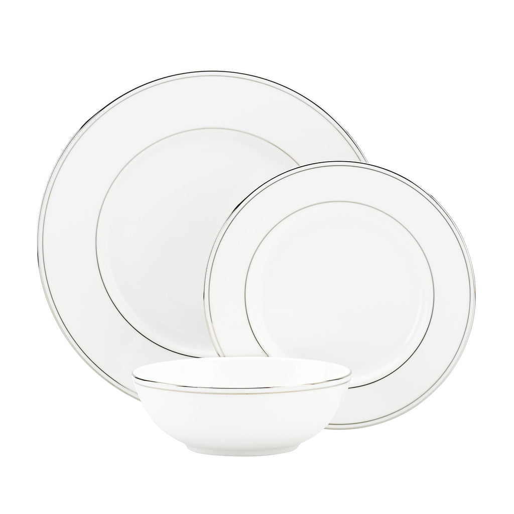 Crafted in durable porcelain and featuring shimmering platinum accents along the rim, this three-piece place setting collection includes a dinner plate, salad plate, and all-purpose bowl. This item is dishwasher-safe, for added convenience.
