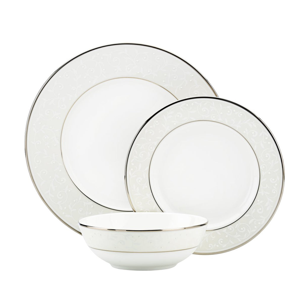 Accented in precious platinum, this durable bone china place setting is dishwasher-safe for added convenience. The regal and sophisticated Opal Innocence 3-piece Place Setting features a gleaming pearlescent motif of hand-applied enamel dots.