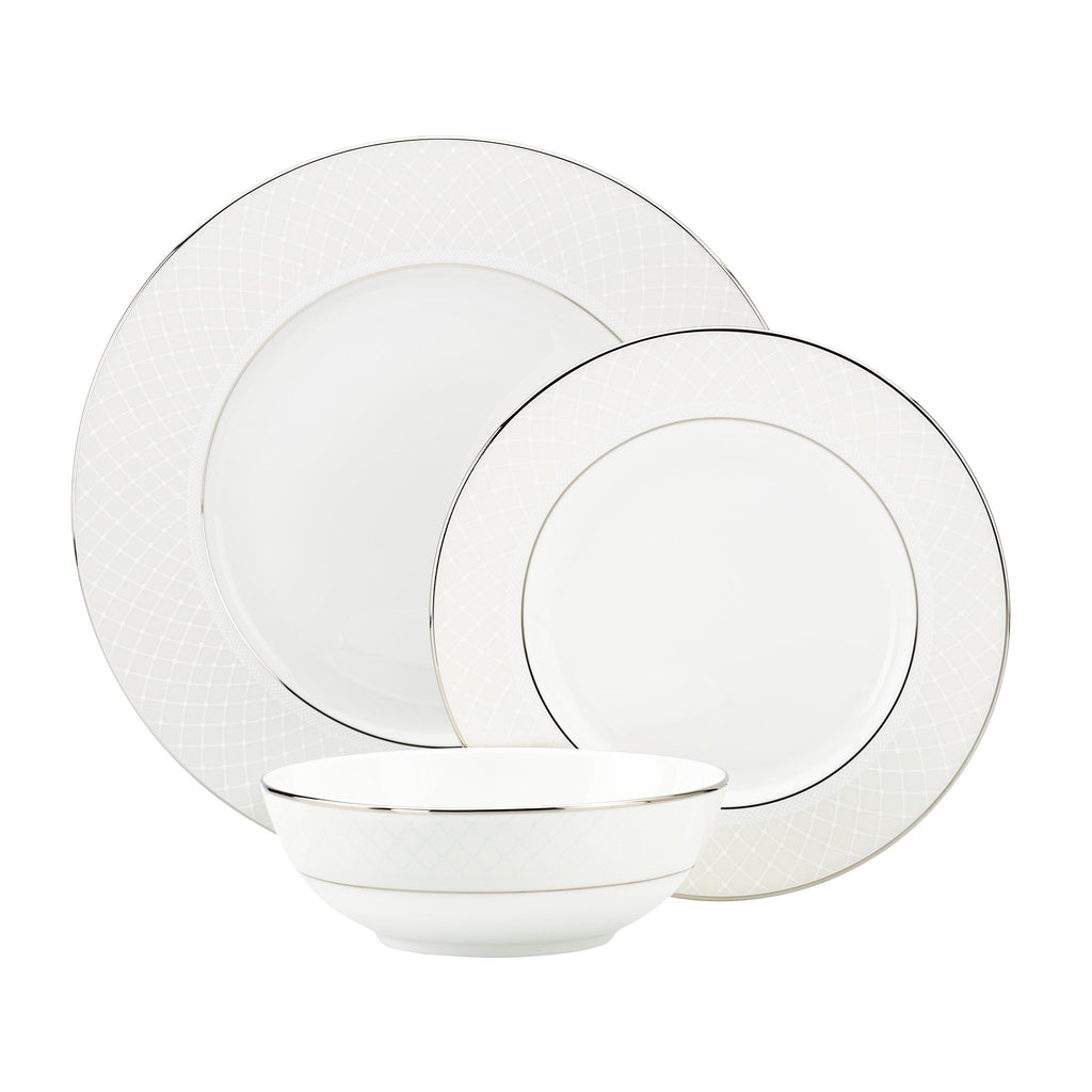 This three-piece place setting includes a lace pattern along its outer border, as well as a shimmering band of precious platinum that adds a hint of grace to the table. Crafted of durable bone china, this item is dishwasher-safe, for added convenience.