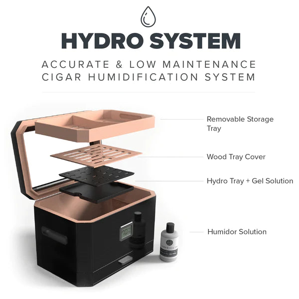 - Cleverly recessed into the base is the included patent-pending Hydro System, an accurate and low maintenance cigar humidification system that makes maintaining your humidor easy