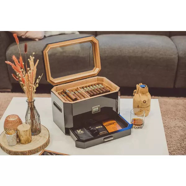 - This luxe humidor features a striking octagon silhouette, posh black piano finish, glass top, front digital hygrometer, accessory storage drawer, and the patent-pending Hydro System