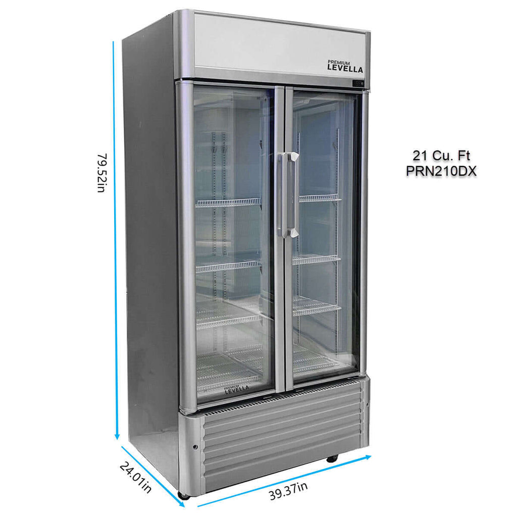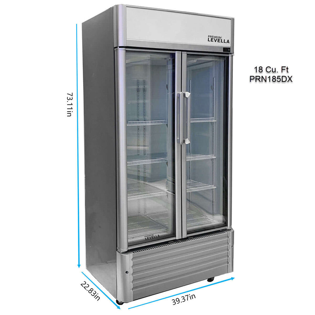 Premium Levella's line of commercial display fridges come in silver and black and have different storing capacities measured in cubic feet. You will also find single, double, and triple door options. Each fridge has a glass door, interior lighting, door lock, internal cooling fan, adjustable shelving, balanced temperature control, and a customizable lightbox for your businesses logo.