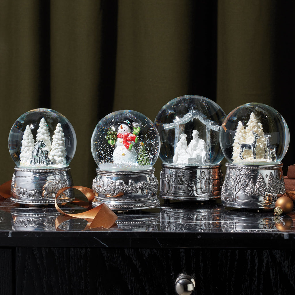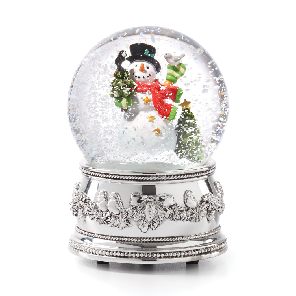 Celebrate the cheer and joy that's in your heart this Christmas. This bright and festive snowman is braving the blizzard of a white, wintery snow globe to bring you gifts and goodies.