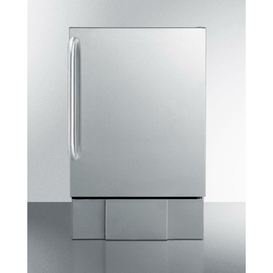Fully wrapped in 304 grade stainless steel, the BIM24OS is designed to stand up to nature with elegant style. The weatherproof design includes a completely sealed back that protects all electrical components and SUMMIT's integrated Ground Fault Circuit Interrupter (GFCI) adds an extra level of protection and automatically resets the unit in the event of power failure. At just over 15" wide, the BIM24OS is easy to place and can be used built-in or freestanding above or below the counter. Storage bases are available in two sizes: Base 32 to raise the height to an ADA compliant 32", or Base 34 to make it adjustable from 33" to 34 ¾" high. The BIM24OS can produce up to 12 lbs. of crescent shaped cubes in a day cycle, storing it in a carefully insulated storage bin. Operation does not require a drain. Our signature 12" towel bar handle completes the package. Free ground shipping on all purchases