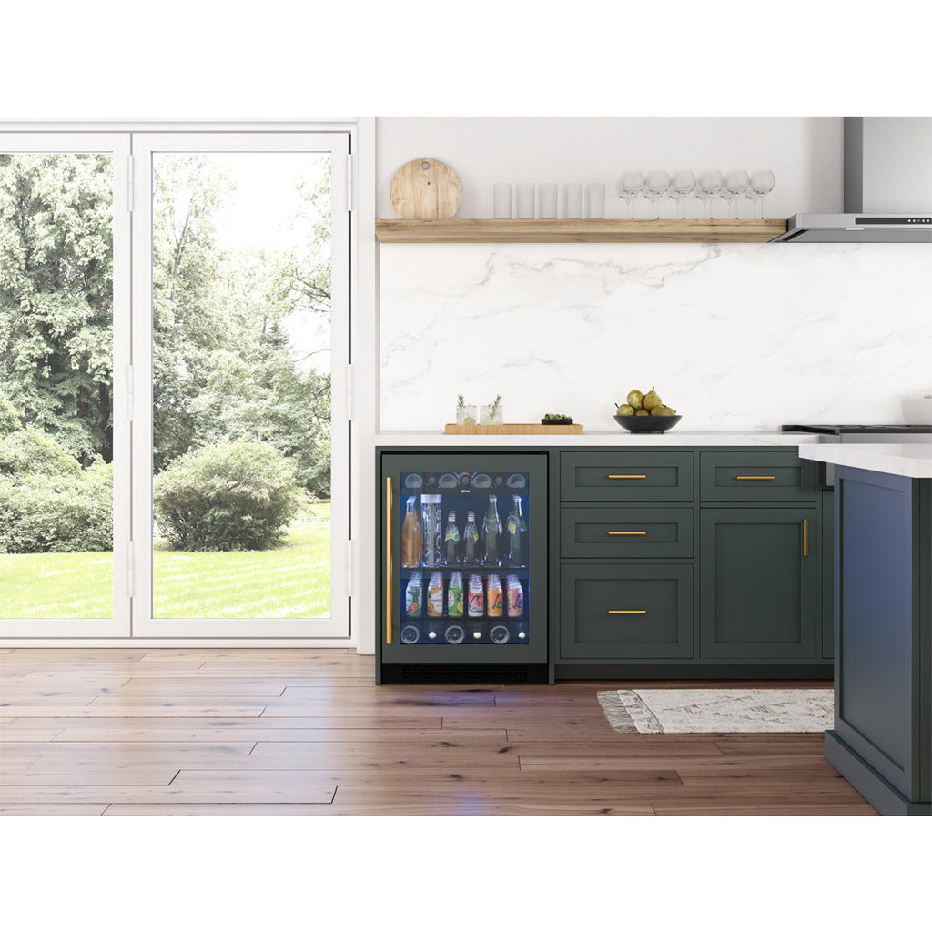 The PRB24C01BPG is a single zone beverage center that holds up to 112 cans. With a front breathing design, this unit can be used for built-in or freestanding use. Custom Panel Ready for you to seamlessly customize to your cabinetry will speak volumes to the stunning elegance this beverage cooler will bring to your home.