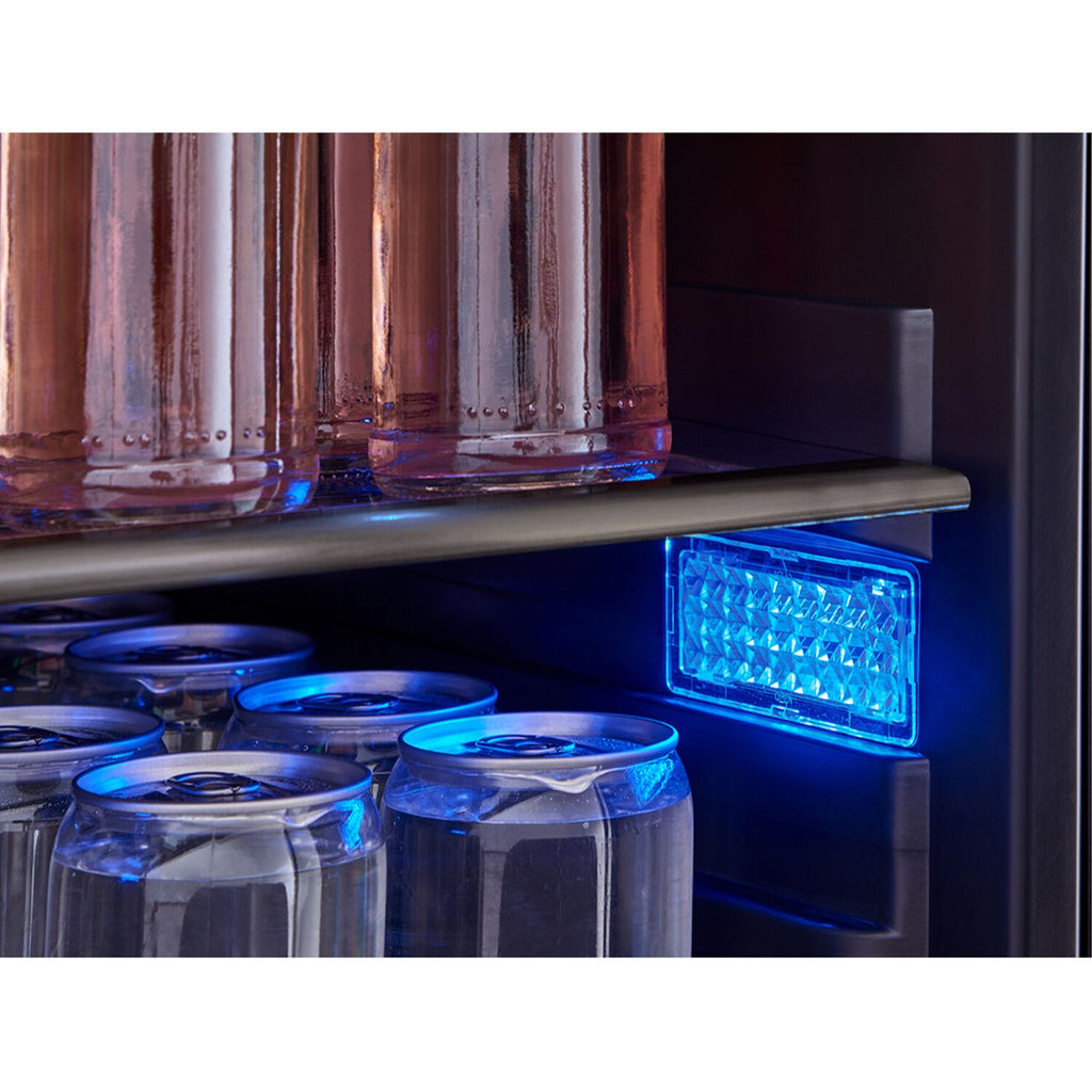 Always have drinks on hand for guests — or just the family — with our 24" Wide Presrv Beverage Cooler. The sleek design of this beverage cooler is made to enhance your kitchen décor with the perfect amount of edge to contribute to a chic, contemporary space. Features include full-extension wooden shelves to hold your favorite wine and adjustable transparent-gray glass shelves for your craft brew collection. Our PreciseTemp and Active Cooling technologies actively work together to maintain and ensure precise temperatures in all corners of your Presrv beverage cooler. Choose from three beautiful LED lighting colors to set any mood and display your collection in style.