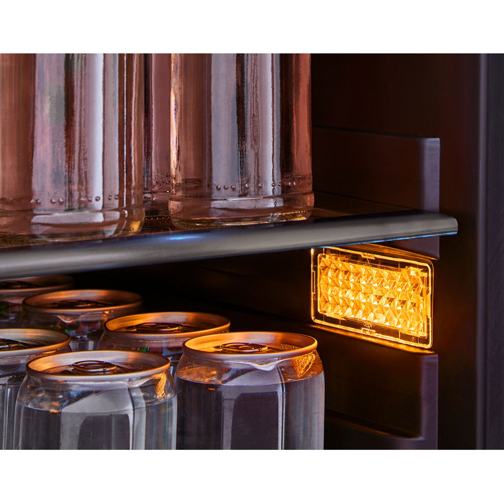 Always have drinks on hand for guests — or just the family — with our 24" Wide Presrv Beverage Cooler. The sleek design of this beverage cooler is made to enhance your kitchen décor with the perfect amount of edge to contribute to a chic, contemporary space. Features include full-extension wooden shelves to hold your favorite wine and adjustable transparent-gray glass shelves for your craft brew collection. Our PreciseTemp and Active Cooling technologies actively work together to maintain and ensure precise temperatures in all corners of your Presrv beverage cooler. Choose from three beautiful LED lighting colors to set any mood and display your collection in style.